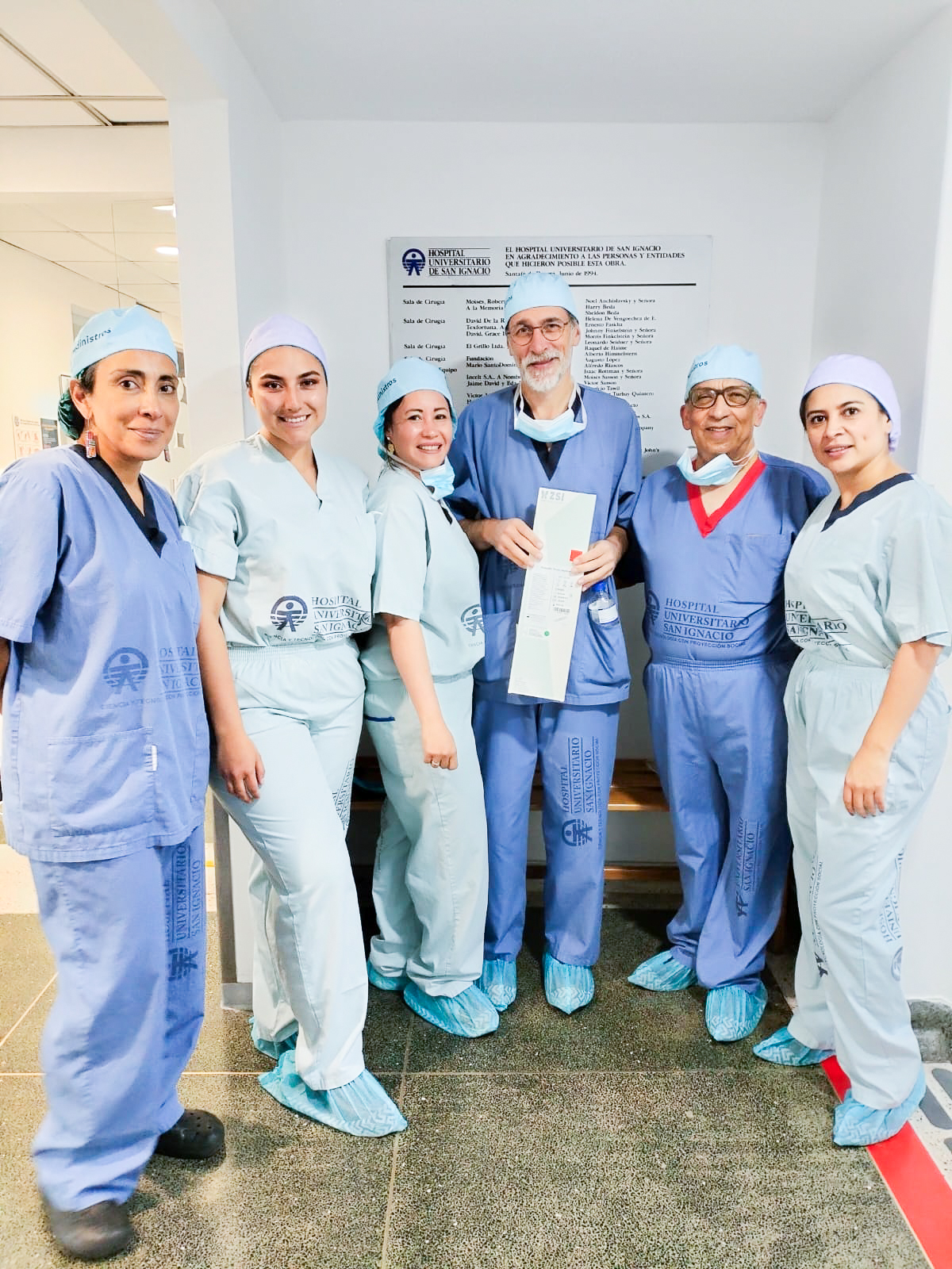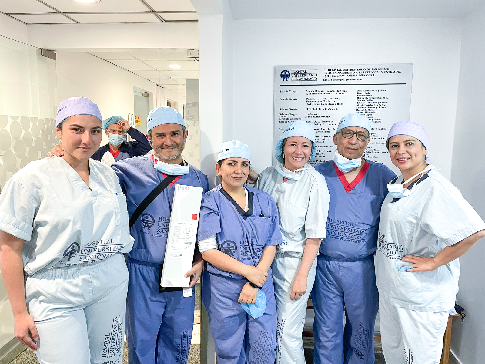 Además, un gran equipo quirúrgico asistió a la implantación: Dra Melissa Cifuentes (Uróloga de Chile), Juliana Orjuela (Soporte Técnico Medinistros), Dra Ana María Vanegas (ZSI-LATAM), Dr Silva (Urólogo Jefe Hospital Universitario San Ignacio), Sandra Casares (Jefa de Línea Urología Medinistro).